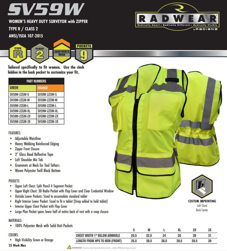 Radians SV59W Ladies Hi Vis Class 2 Heavy Duty Safety Vest, Surveyor Style Hi Vis Lime Green or Hi Vis Orange